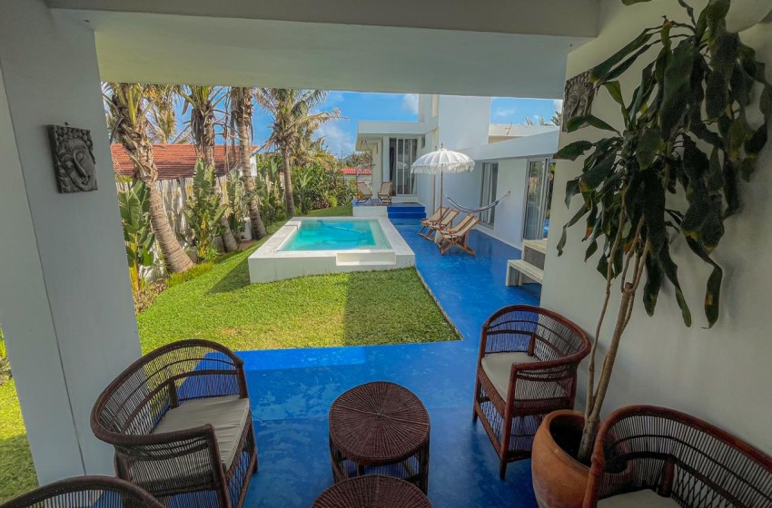 Tucked away in a quiet residential part of Ponta do Ouro, just 20 metres from the beach, Surfer’s Spot is an easy, laid-back escape ideal for families or groups looking to surf, unwind and enjoy beach life at its best. This comfortable beach house is located just one home back from the main swimming bay and a short walk from local markets, restaurants, and surf spots — including one of Africa’s longest waves. Surfer’s Spot sleeps up to 8 guests in three air-conditioned bedrooms: • Bedroom 1: Queen bed with en suite bathroom (large shower, toilet, double basin) – Sleeps 2 • Bedroom 2: Queen bed - Sleeps 2 • Bedroom 3: Two bunk beds – Sleeps 4 • Bedrooms 2 and 3 share a bathroom with shower, toilet, and basin • All beds have custom-made mosquito nets The home includes a separate children’s lounge with books, a TV, and soft seating — the perfect space for little ones to relax and play while adults enjoy the main lounge or outdoor entertainment area. The fully equipped kitchen includes: • Gas hob and electric oven • Microwave • Fridge and freezer • Coffee machine • Kettle • Washing machine • All cutlery, crockery, and cookware for self-catering The open-plan living and dining area flows through sliding doors into a lush, private garden with shaded seating and a built-in braai. A large wooden dining table seats 9 guests comfortably, creating an inviting outdoor space to gather after long beach days. WiFi The house has a wifi router; you need to buy data. 1 Gig costs around 50 meticais. Private Swimming Pool Surfer’s Spot now features its own private swimming pool — ideal for cooling off in the afternoons or enjoying relaxed poolside days in the sun. Additional Facilities: • Air conditioning in all bedrooms • Bed linen and bath towels provided (bring your own beach towels) • ZAP TV with USB port • Outdoor shower • Daily housekeeping • Secure parking Beach Access & Activities A short 20-metre walk brings you to the beach, perfect for surfing, swimming, or long barefoot strolls. Ponta do Ouro offers a vibrant mix of surf, local flair, and family-friendly charm — with dive centres, restaurants, markets, and essential amenities nearby. Travel Information Surfer’s Spot is easily accessible without the need for a 4x4 vehicle. The Kosi Bay border is just a 30-minute drive away. Whether you’re a surfer chasing waves or a family seeking a relaxed coastal break, Surfer’s Spot offers the perfect base to enjoy the warm waters and easy rhythm of life in Southern Mozambique.