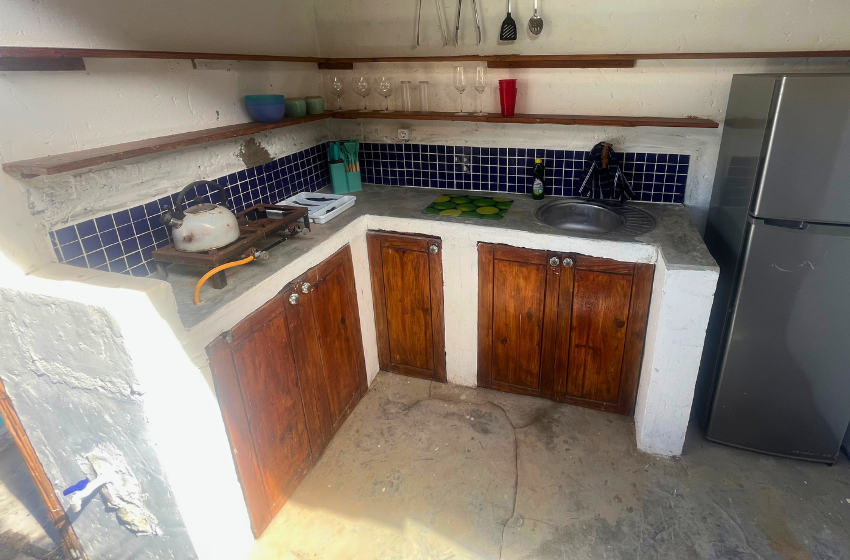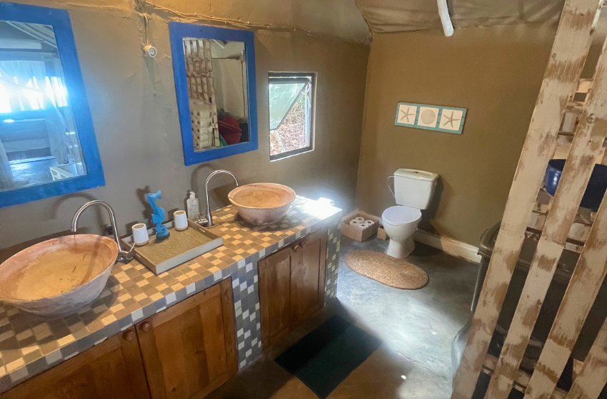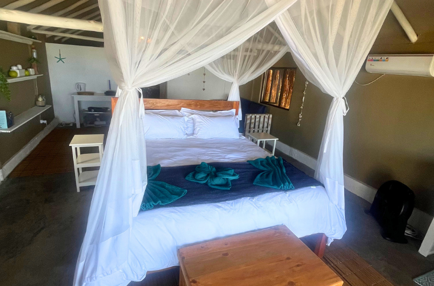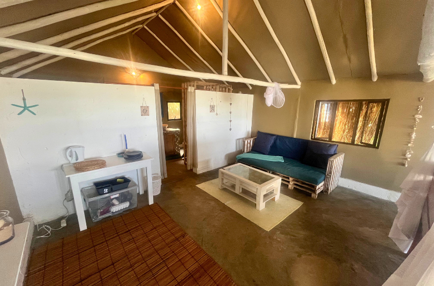 Escape to a unique coastal retreat where the bush meets the beach at Baleia Azul Tent No. 8, located within the tranquil Baleia Azul Estate in Ponta Mamoli. Surrounded by natural vegetation and overlooking the ocean, this luxury safari-style tent offers a peaceful setting for guests looking to unwind while staying close to nature. Accommodation The tent is designed to provide both comfort and simplicity in a natural setting. At its centre is a king-size xtra length bed with mosquito net, ensuring a restful night’s sleep. The tent also includes a single sleeper couch with a mosquito net, suitable for an additional guest or child. There is ample space for a blow-up mattress, should guests wish to bring one (bedding not provided). The en-suite bathroom features a shower, double vanity basins, and a toilet connected to a septic tank system. Outdoor Living A spacious wooden deck extends from the tent, offering a relaxing space to enjoy the surrounding views. Guests can cool off in the private splash pool or enjoy meals at the four-seater outdoor dining table. Kitchen Facilities The outdoor kitchen, located just outside the tent, is equipped for easy self-catering and includes a double gas burner and braai, along with crockery, cutlery, pots, pans, and cooking utensils. An outdoor shower is also available, ideal for rinsing off after time spent at the beach. Comfort & Connectivity To ensure a comfortable stay, the tent is equipped with air conditioning and a fan. While the setting offers a quiet escape from everyday life, guests can purchase a local SIM card for mobile reception if they wish to stay connected. Activities & Surroundings Just a short distance from the tent lies Frederico’s Reef, a popular spot for swimming and snorkeling. At low tide, the reef reveals vibrant marine life and calm tidal pools, making it an ideal place to explore the ocean. Baleia Azul Tent No. 8 offers a relaxed and memorable way to experience the beauty of Mozambique’s coastline — perfect for couples or small families looking for a peaceful seaside escape surrounded by nature.