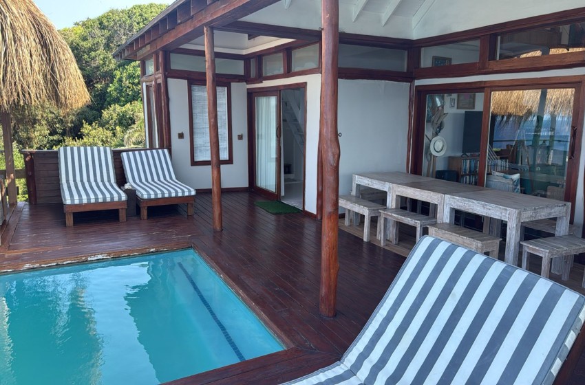This holiday home is situated on a well-managed housing estate in Ponta Mamoli. Situated on Fredericos Bay snorkeling spot. The beautiful beach house consists of the following: This home has 4 en-suite air-conditioned bedrooms: Bedroom 1 - sea-facing with 1 extra-length king-size bed sleeping 2 adults plus a loft with a queen-size mattress that sleeps 2 children under 12. (en-suite bathroom with shower and bath) and opens onto the swimming pool deck. Bedroom 2 - Inland facing, 2 single extra length beds, ensuite bathroom with shower, toilet, hand basin (beds can be pushed together) Bedroom 3 - is a loft with 2 single beds. Has a bath, toilet, and hand basin Bedroom 4 - sea facing with 2 single extra length beds (en-suite bathroom with a shower toilet, and hand basin) sleeping 2 adults. has a mattress converter to change the bed to a King size There is a guest bathroom downstairs. The open-plan kitchen is fully equipped for self-catering, it has an upright fridge freezer combo, toaster, kettle, microwave, Expresso Delta coffee machine, (take your own pods), and gas oven/hob. No washing machine, however, you can ask the staff to hand wash clothing, etc. The lounge area has panoramic sea views. The lounge has a TV no DSTV, however you can stream using the WIFI. There is a shelf with books to utilize should the weather not be great. The living area opens up with sliding doors onto a wooden deck with a sunken swimming pool, overlooking the ocean. The house also boasts a newly built hot tub. PLEASE NOTE: THIS IS A WOODEN HOUSE. Fire is extremely dangerous and must never be made in an uncontrolled manner. There is an outside shower to rinse off after a day on the beach. There is a braai area that has a built-in charcoal/wood braai. Ensure you bring snorkeling equipment along. Enjoy your stay!